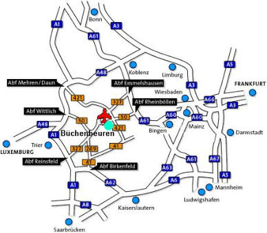 Büchenbeuren und der Flughafen Hahn liegen verkehrsgünstig zwischen der A 61Ludwigshafen - Köln im Norden(20 Minuten Rheinböllen), derA 48 Trier - Koblenz (30 Minuten Wittlich) und derA 62Trier - Kaiserslautern, (35 Minuten Birkenfeld).
